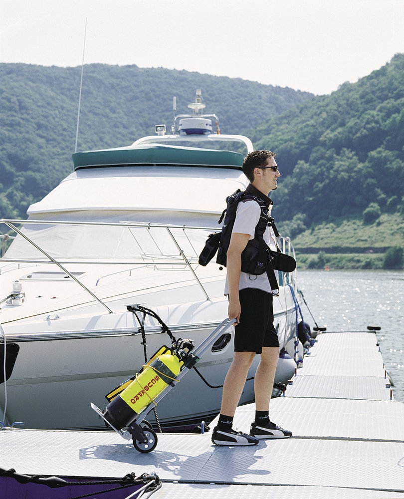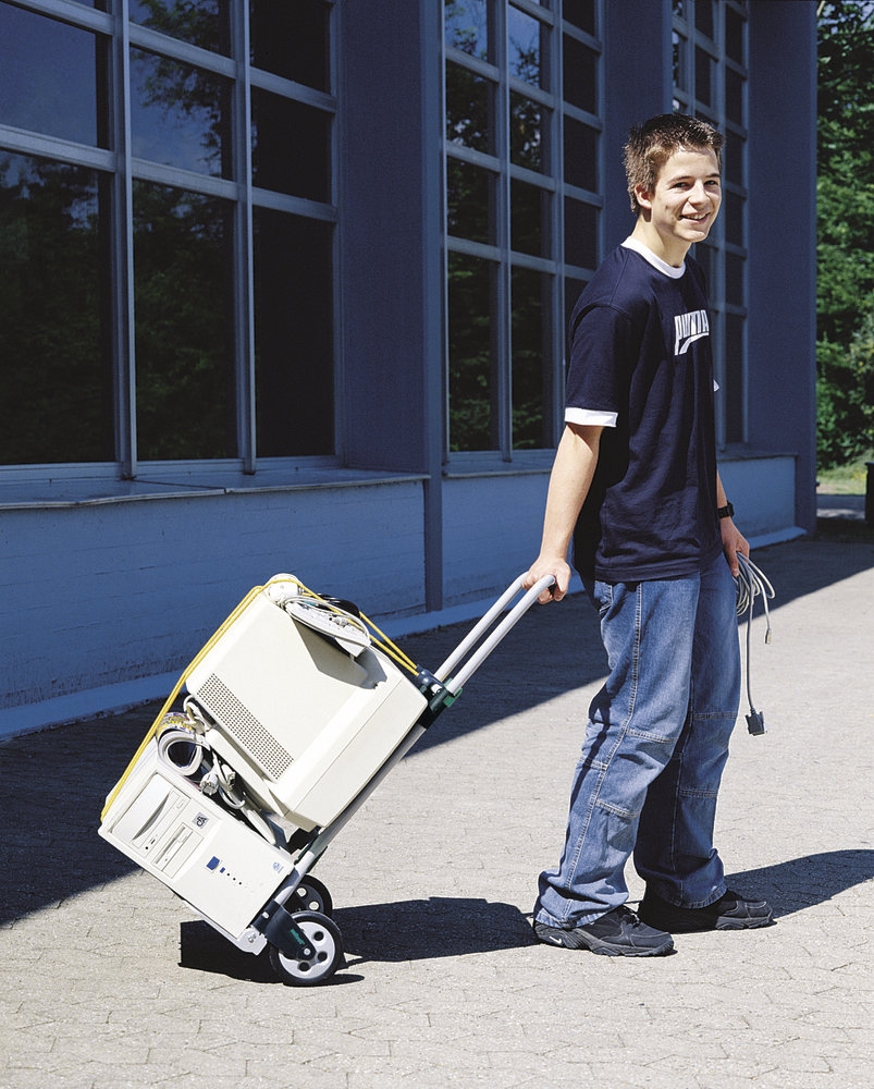 Το καρότσι αλουμινίου TS 600 της Wolfcraft , χάρη στις πτυσσόμενες ρόδες και στα ελατήρια ανοίγει εύκολα με μια απλή λαβή.